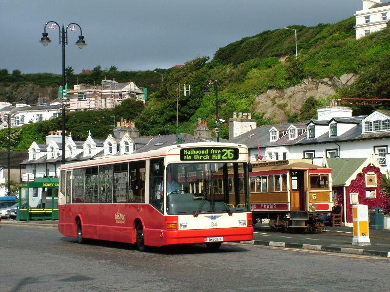 Dennis Dart/Marshall 34 (OMN24R) passes the Derby Castle terminus of the Manx Electric Railway.