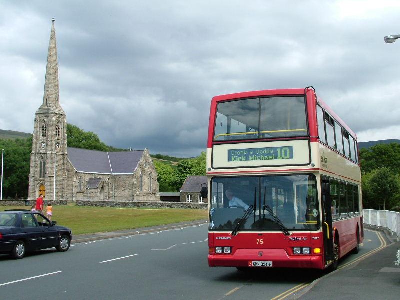 | The historical seat of the Manx Governemnt is Tynwald Hill at St Johns. Here 75 (FMN324F) - a Dennis Trident - well variety is the spice of life they say! - with the earlier East Lancs Lolyne body passes on route 10. | |