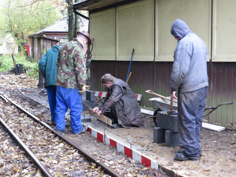 The first task was to break off all the old bricks which formed the previous platform edge. These had been in place since the platform was built in 1984. Fortunately, the blocks forming the base were found to be in reasonable condition apart from one short length which was cleaned out and the blocks reset.