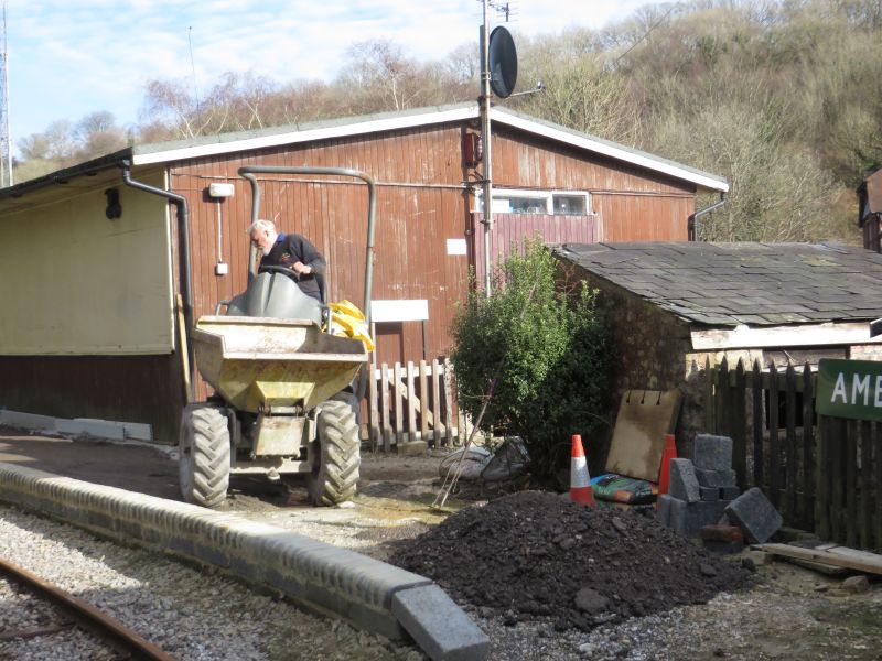 By the beginning of March we were able to bring in the filling material to raise the platform surface up to the level of the new platform edge. Here is Tony Johnson bringing another tipper-load for us to spread.