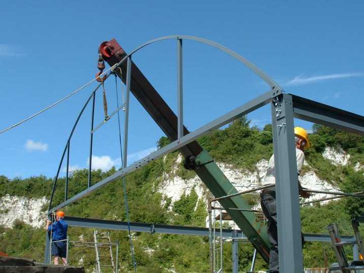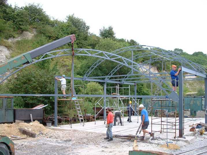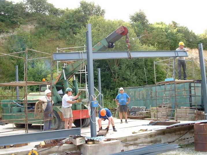 Early August and the side beams for the frame were lifted into position using the Museum's antiquated crane.