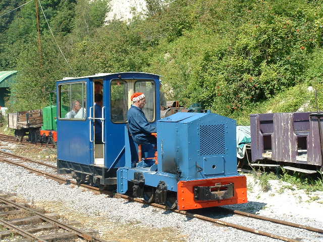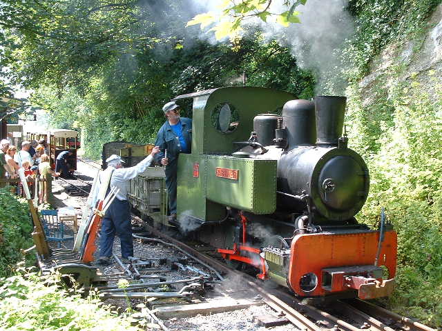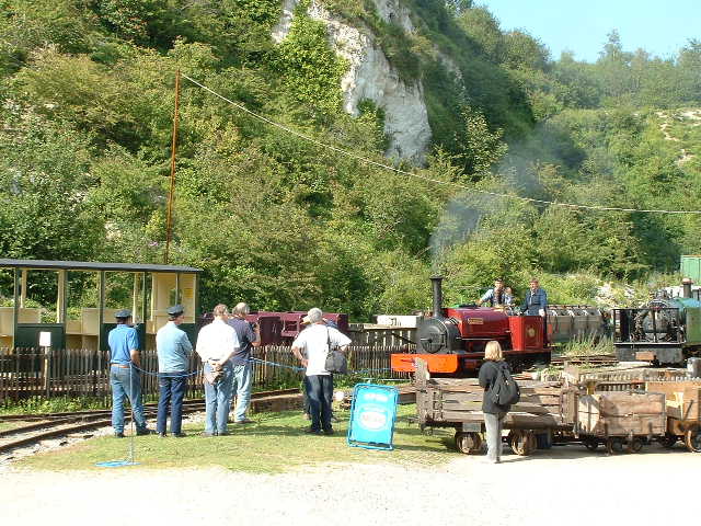 Barbouilleur, our Decauville locomotive (1126/1947) takes the single line token from the pointsman at Amberley points at the start of its uphill journey. Its train is made up of former MOD ammunition wagons.