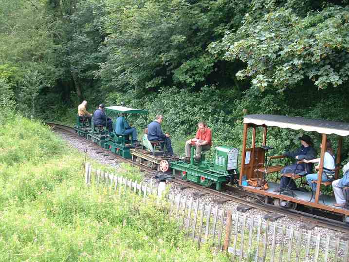 Graham Feldwick, who was instrumental in the organisation of the event, aboard his petrol engined Lister Railtruck, followed by his diesel engined example, heading a train of small