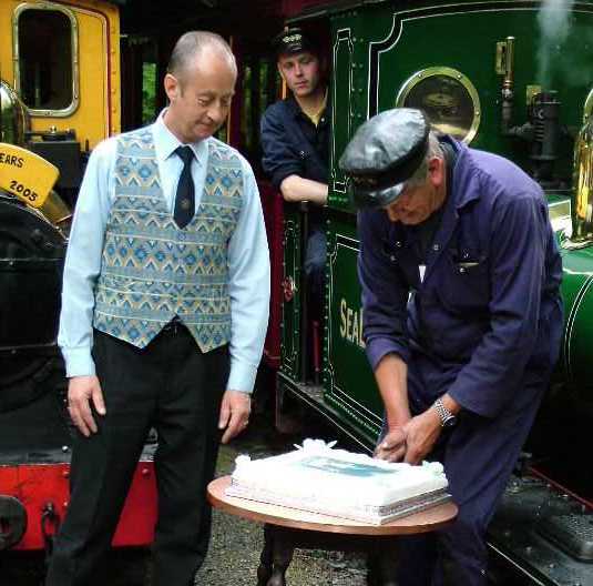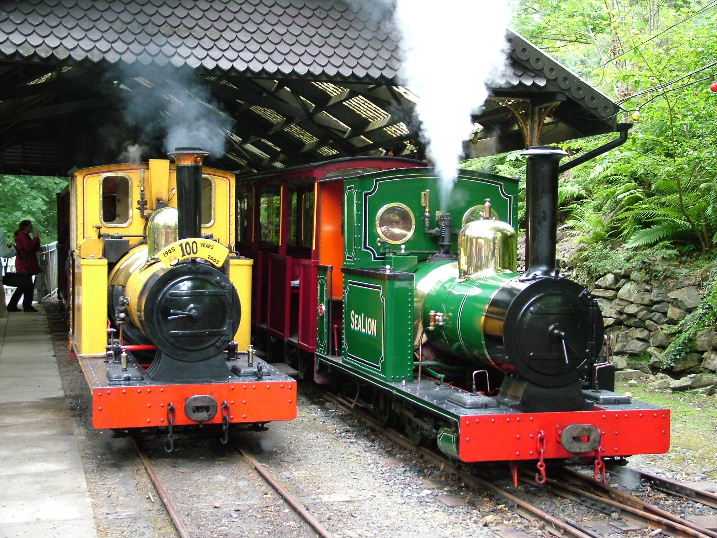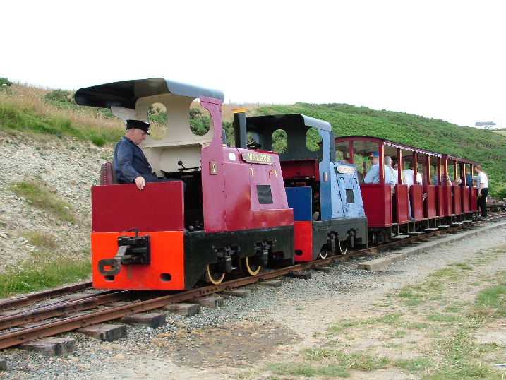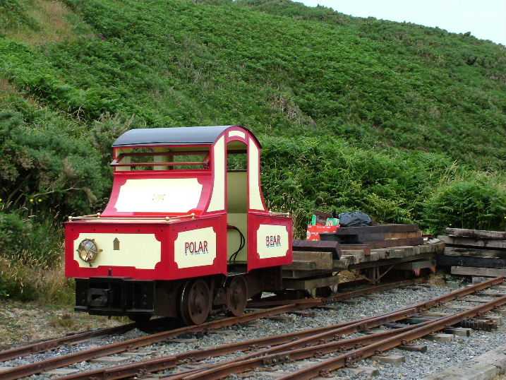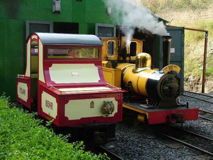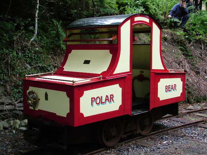 Outside the shed Polar Bear with - er - Polar Bear? Yes, in 1927 the old GGR company replaced their two steam locos with two battery electric locomotives named, oddly enough, Sea Lion and Polar Bear. They were not a resounding success - one, Polar Bear, actually derailed and finished up in the bottom of the Glen. The steam locos were quickly reinstated! However, a replica of one of the battery locos has now been put into service by the present management although it uses a modern electronic control system which makes driving it exceedingly easy!