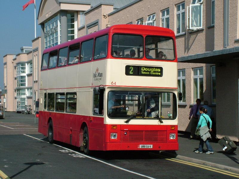 The main service from Douglas to Port Erin serves Ronaldsway Airport. 64 (BMN64V) pauses to pick up passengers heading towards Douglas.