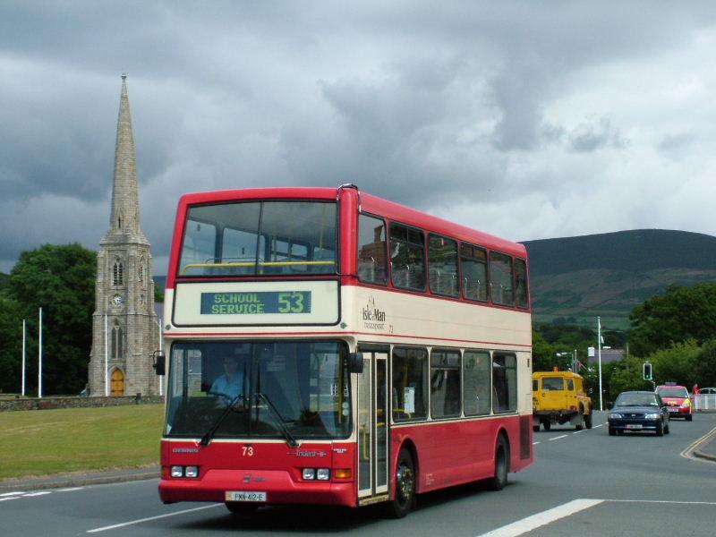 Tynwald again, with similar bus 73 (FMN412E) in a school bus working numbered 53.