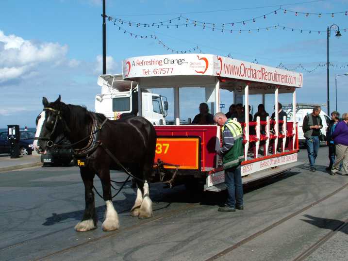 Horse Tram 37 plus equine motive power (1 h.p.) at the Sea Terminal terminus of the Douglas Horse tramway. It is popular with tourists but these days only manages a basic half-hourly service using just two cars.