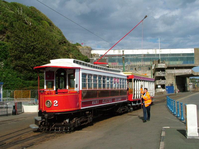The trolley pole is swung ready for the shunt back up the hill to the depot. Thederelict Summerland Leisure complex in the background has since been demolished.