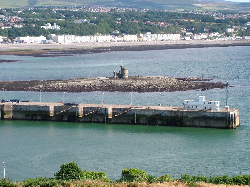 The white buildings line Douglas promenade and the harbour entrance is in the foreground. In the centre is St Mary's Rock. The small castle-like edifice is the Tower of Refuge.