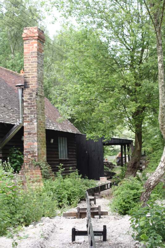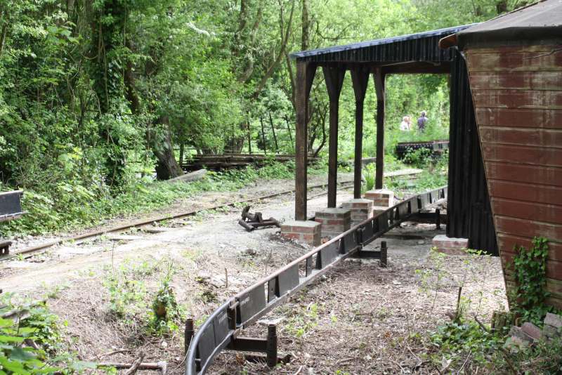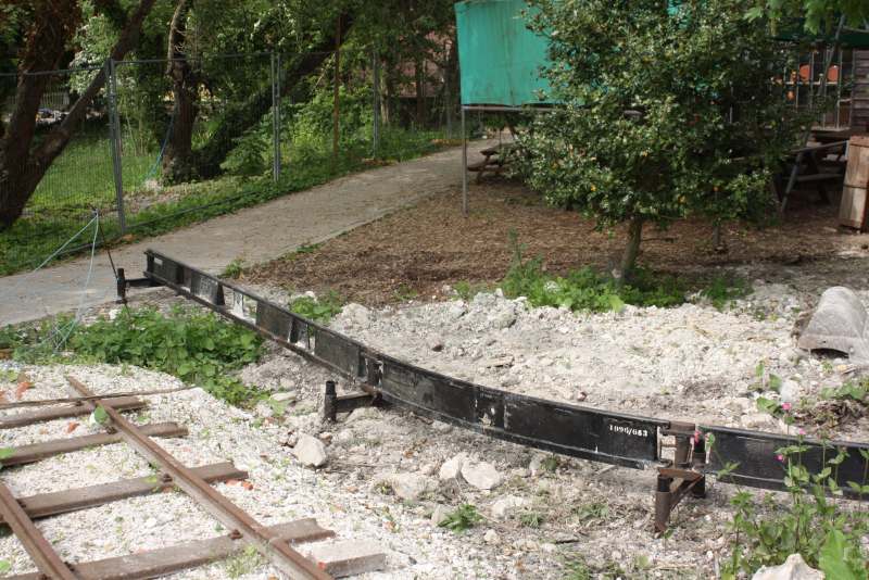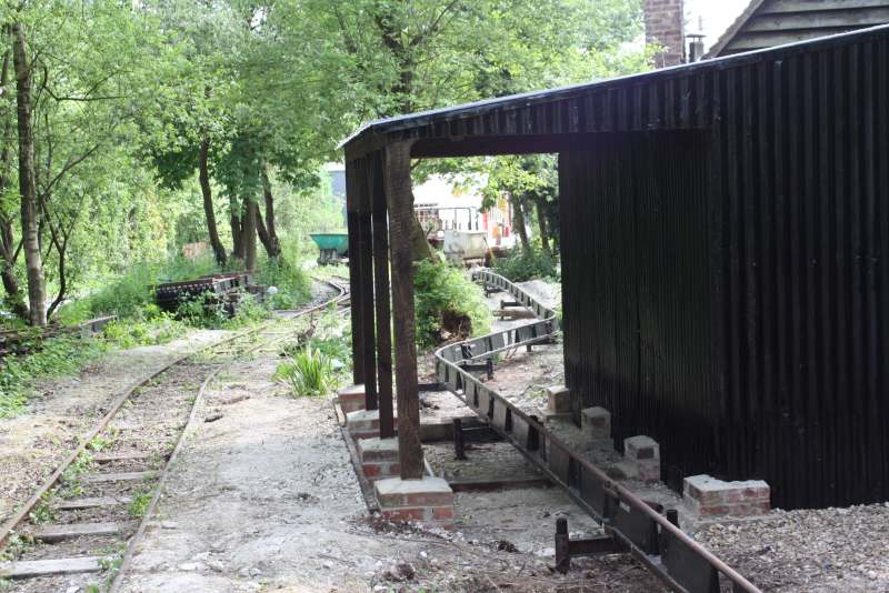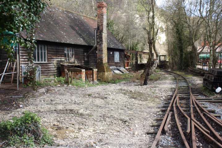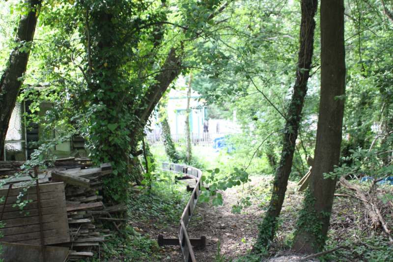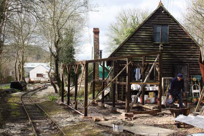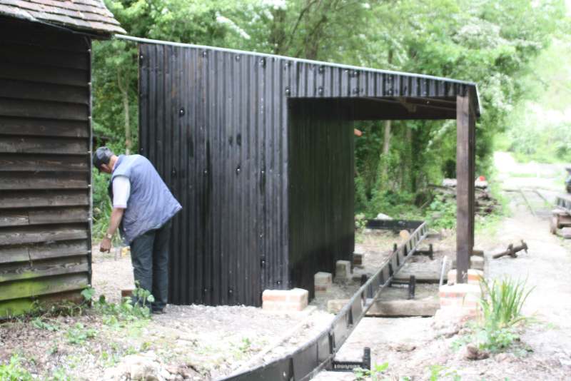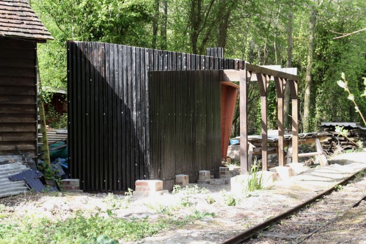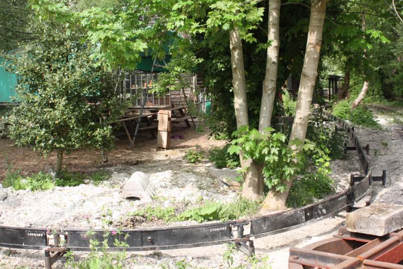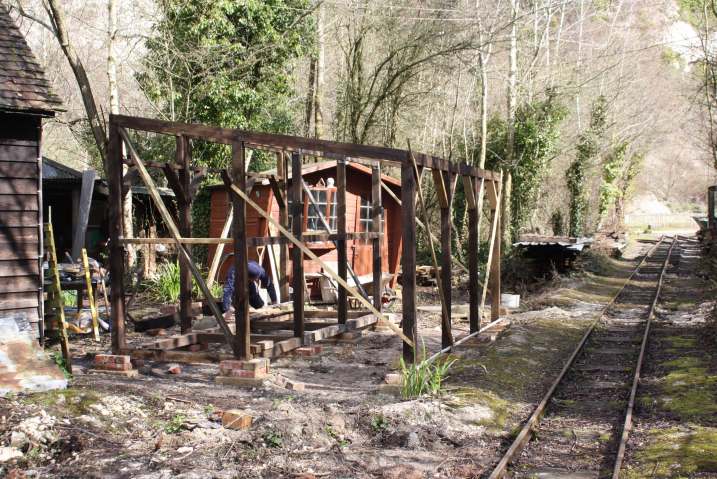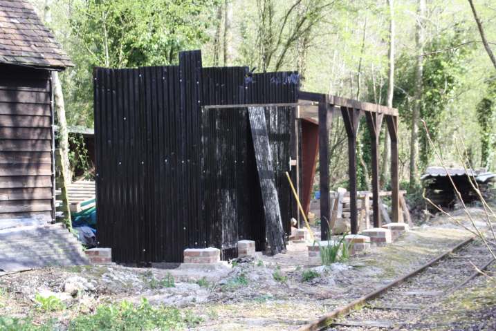 The main obstacle was the pottery wood store but this has been demolished by members of the RailGroup and is being rebuilt to provide a new store for our potter and also a covered area for the monorail skip to be stored when not in use. The framework of the new construction is at an advanced stage in this shot.