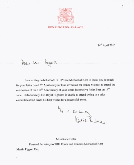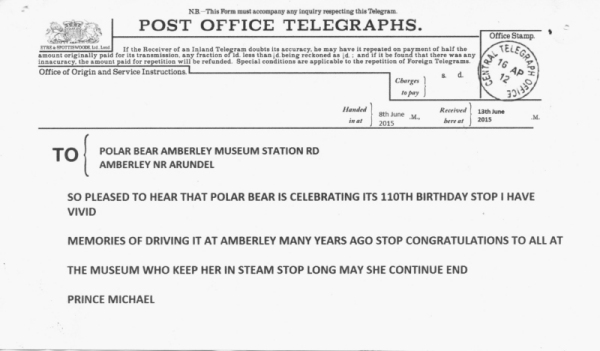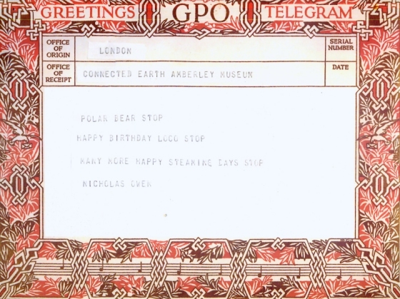 We also received a greetings telegram from Nicholas Owen who, as you may recall, came to Amberley in 2013 to relaunch Polar Bear after a major refit. He had been invited to the party but was not able to make it.