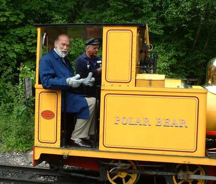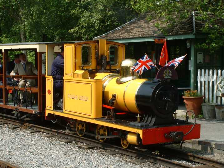 The Prince was transported by train in the Groudle Glen coaches hauled by Polar Bear (of course!). The train arrives at Brockham with HRH Prince Michael visible in the first coach.