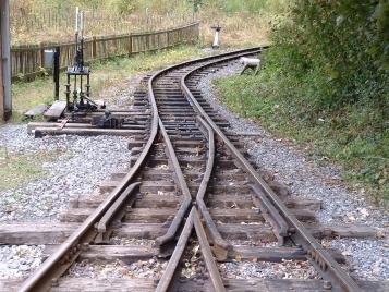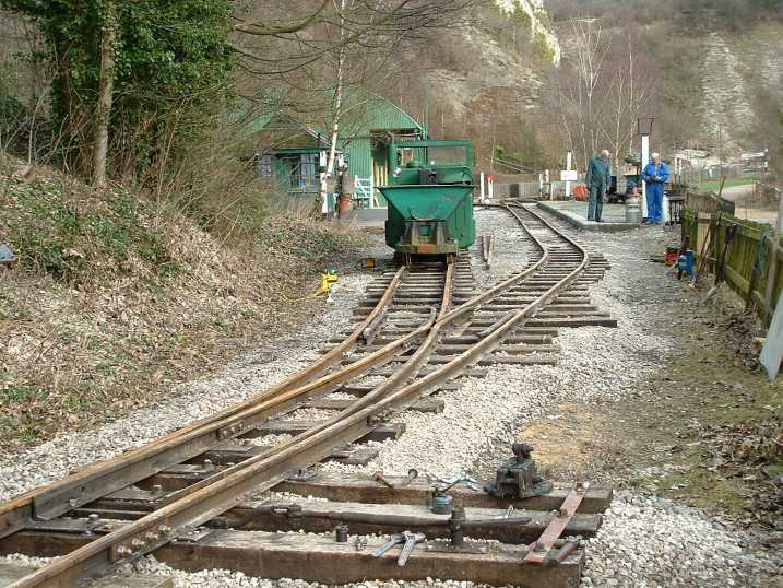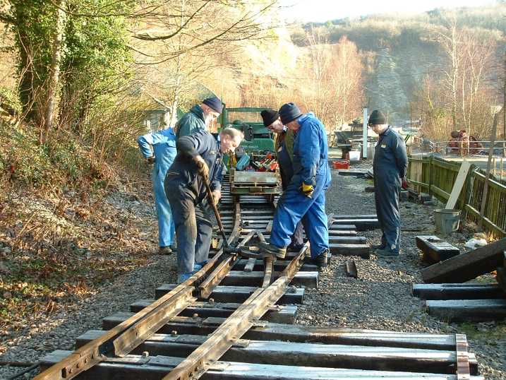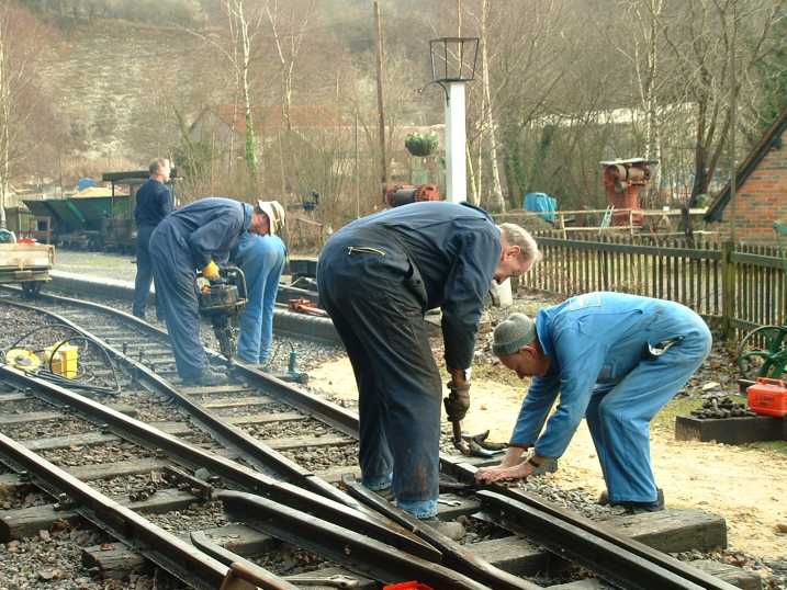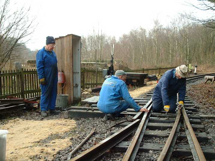 The following pictures show just one example of a major engineering project tackled by the RailGroup at the Museum over the winter period - in this case, 2003/4. The job was to extend the length of the run-round loop at Brockham which involved moving the points from their present position to a new location on the bend approaching the station. This involved not only dismantling the points but also reforming the geometry to suit the new layout. It was transformed from a conventional right-hand turnout to a curved left hand. Here is how we did it.