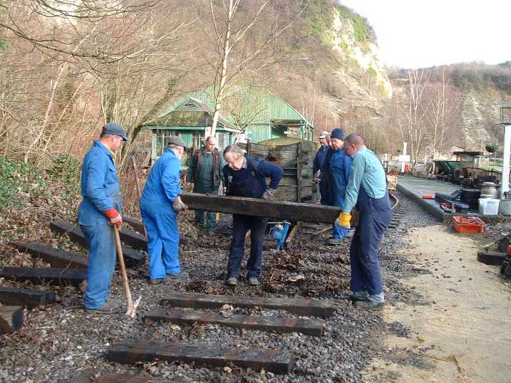Then the old timbers were lifted (some are sufficiently good to reuse - others only on the industrial railway) and replaced by new (second hand) sleepers which can be seen lying on the bank ready for placing in position.