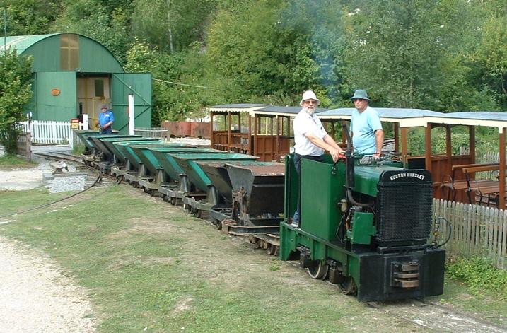 Of the Hudson Hunslet locomotives at Amberley, the one that sees most use is this one. Unfortunately, the works number of this loco is not known - it arrived from Star Construction of Partridge Green, West Sussex in a crate having never been used by them. However, all was not new - various parts had been robbed and swapped. It has been fitted with air brakes for use on our passenger services but here we see "Blue Star" on a long skip train, marshalled ready to receive the next delivery of track ballast.